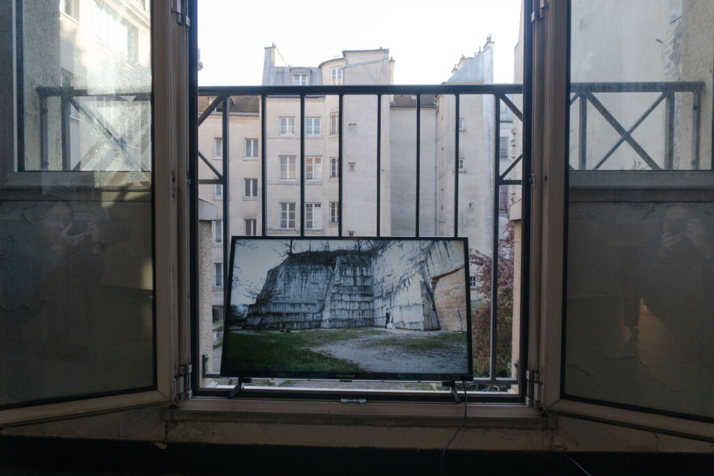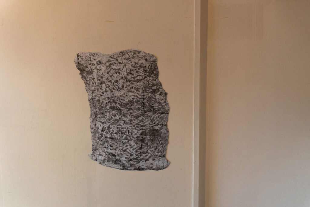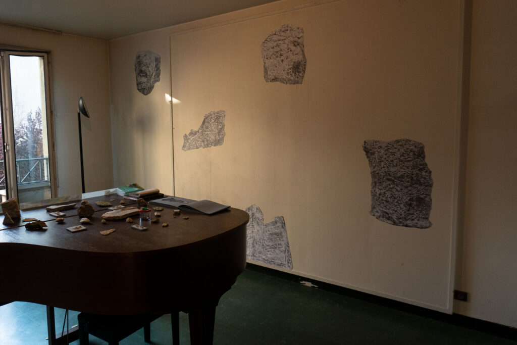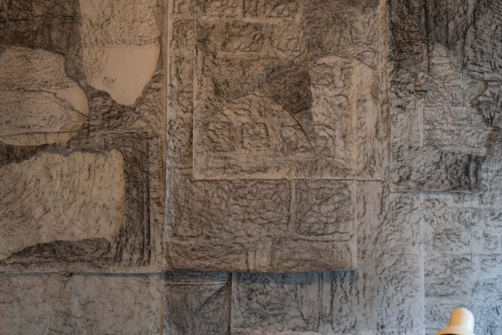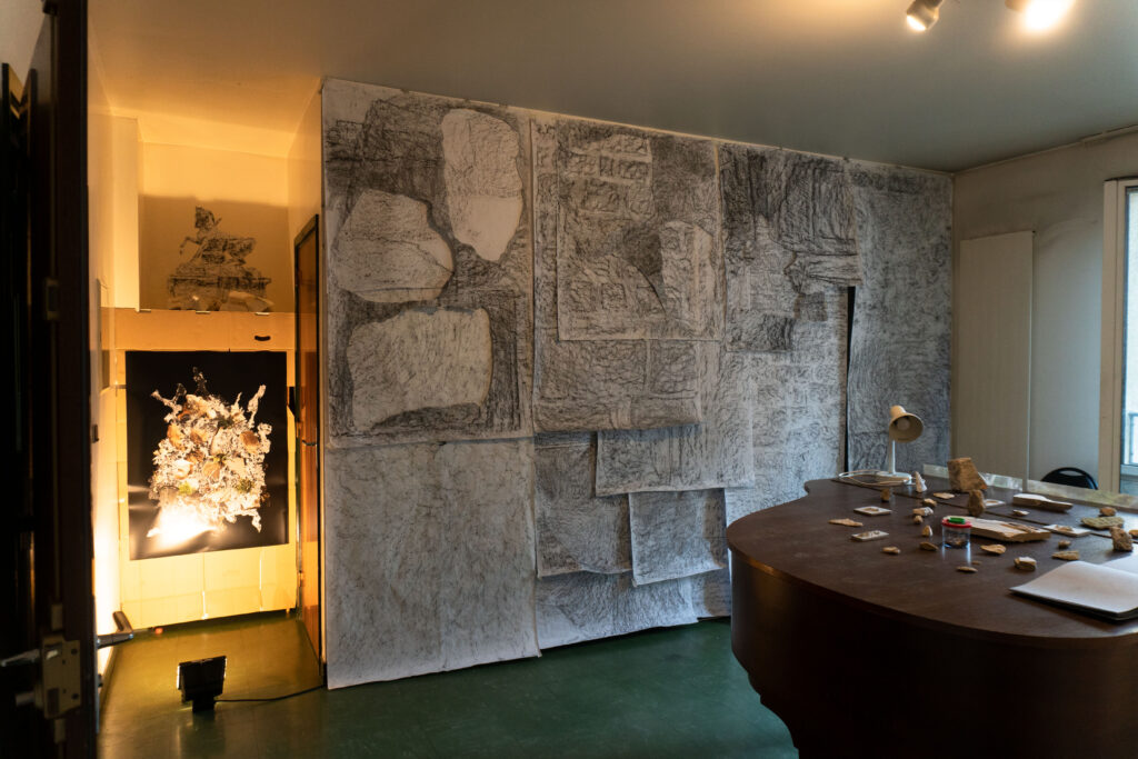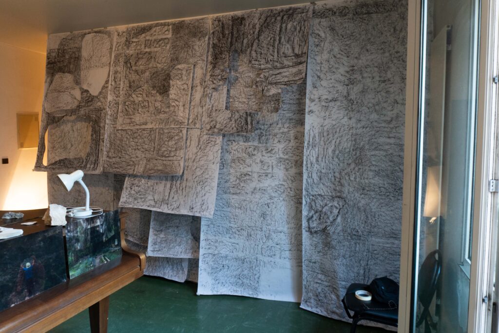 When I came to Paris I was amazed that this city was built by limestone that was extracted underneath the city a long time ago. The limestone moves out from the underground to above as statues, buildings, monuments or houses and then becomes the city that is maybe so anthropocentric.  Then, I started to walk around the city and visited a former limestone quarry at Saint Maximin to interact with them by capturing through scrubbing the texture of the stone over the paper in some places – which is for me, it is not just a texture but also a scar of the stone itself and the memory of how we as humans interact with them.
